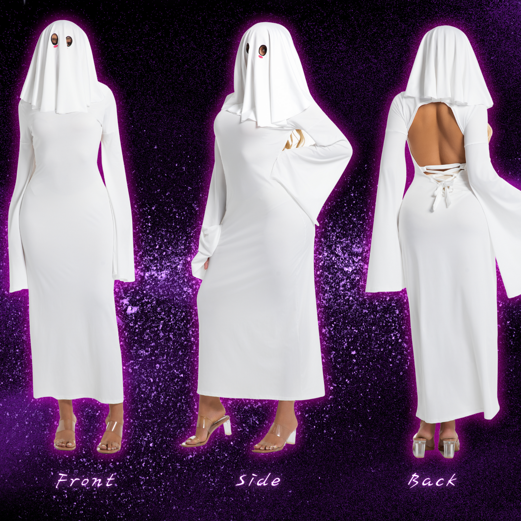 Beautiful ghost costume! This gorgeous outfit includes the dress and the mask (head cover). The dress is backless and the missing piece of the back is very large, there is a lacing included but be prepared that it's backless not just a small circle. I was thinking I would get a cape to cover it because I'm not young, but it's a lot of fabric missing lol just be prepared. Also, I'm 109 lbs and got the size medium thinking costumes always run small, but I'd have been better just ordering the small. It's well made and a fantastic costume.